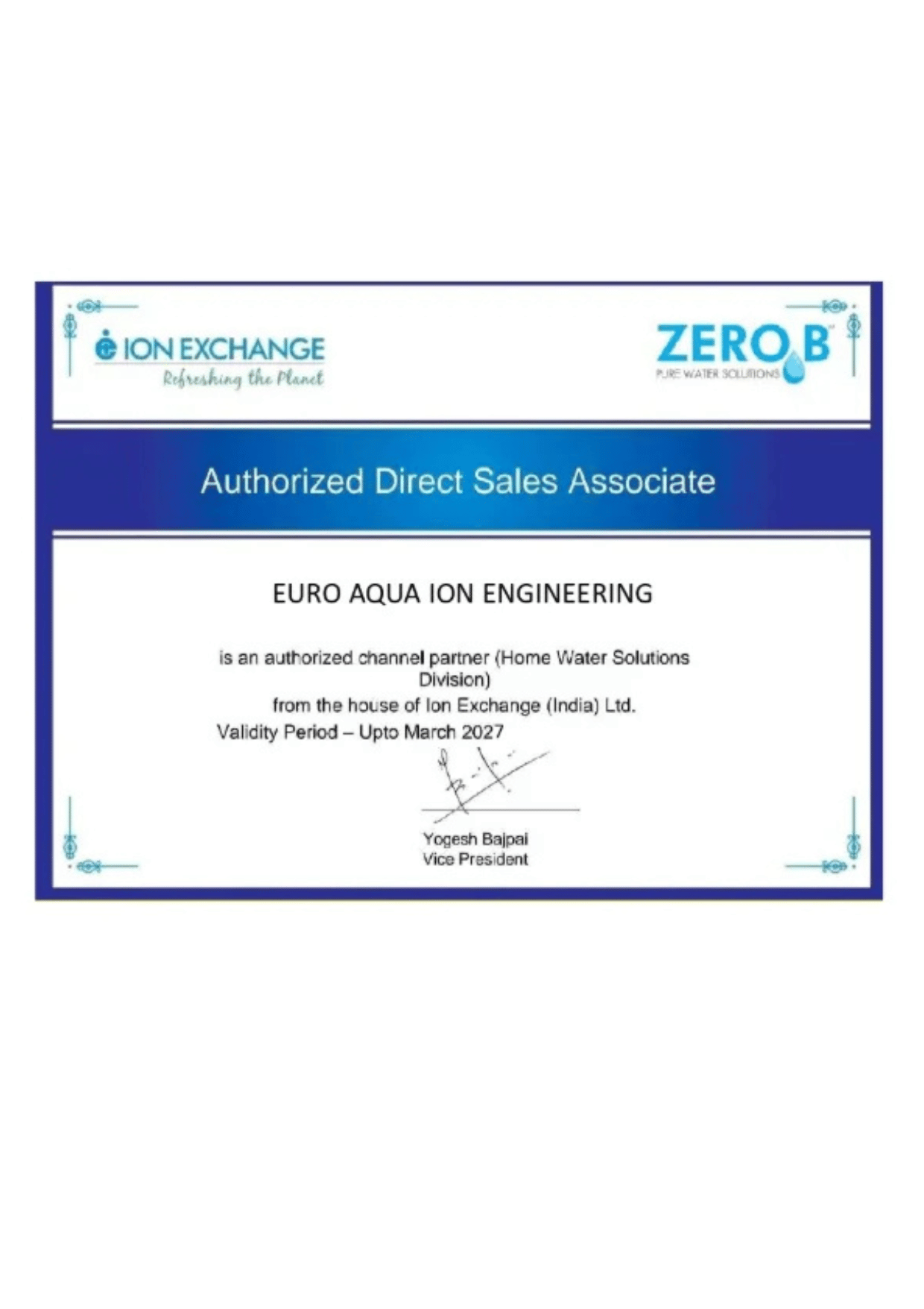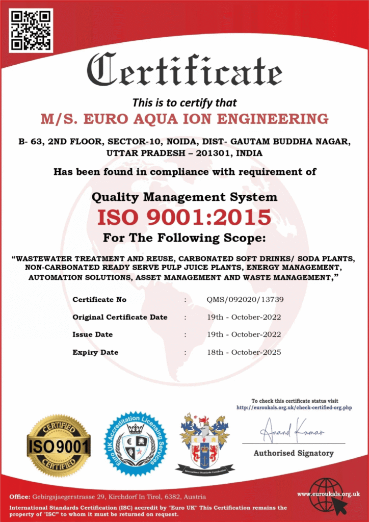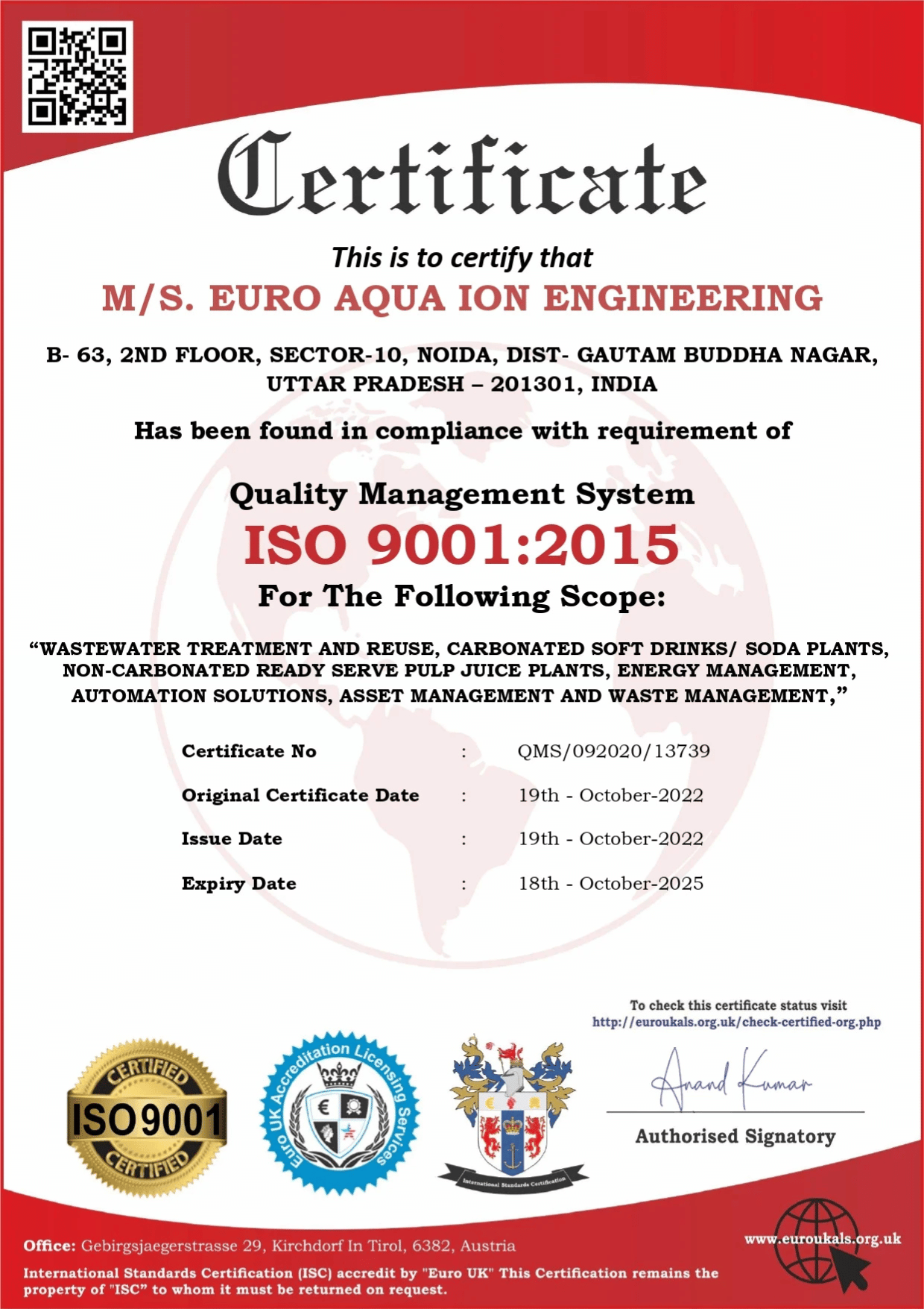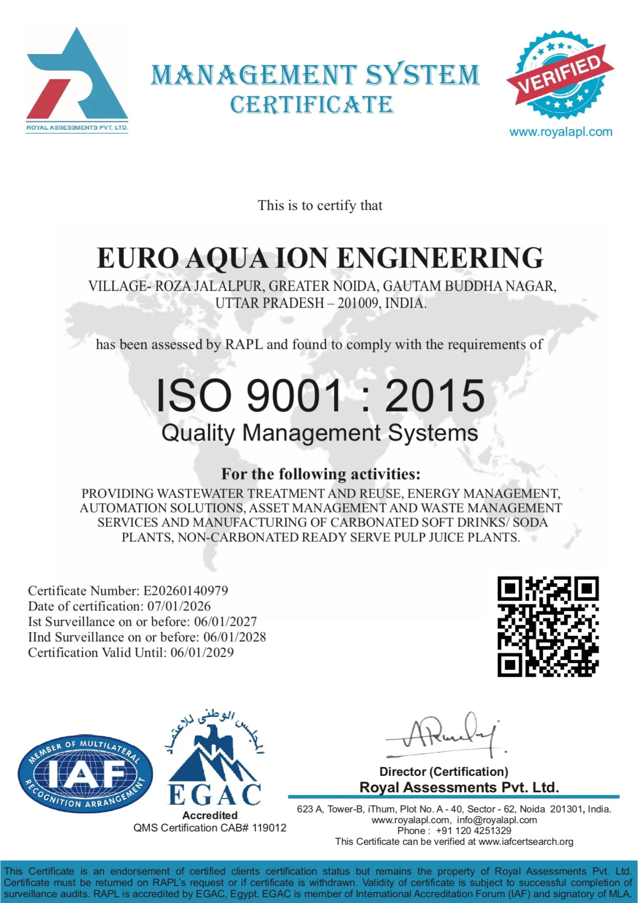 This ISO certification demonstrates that Euro Aqua Ion Engineering follows international quality management standards in manufacturing and delivering water treatment solutions.