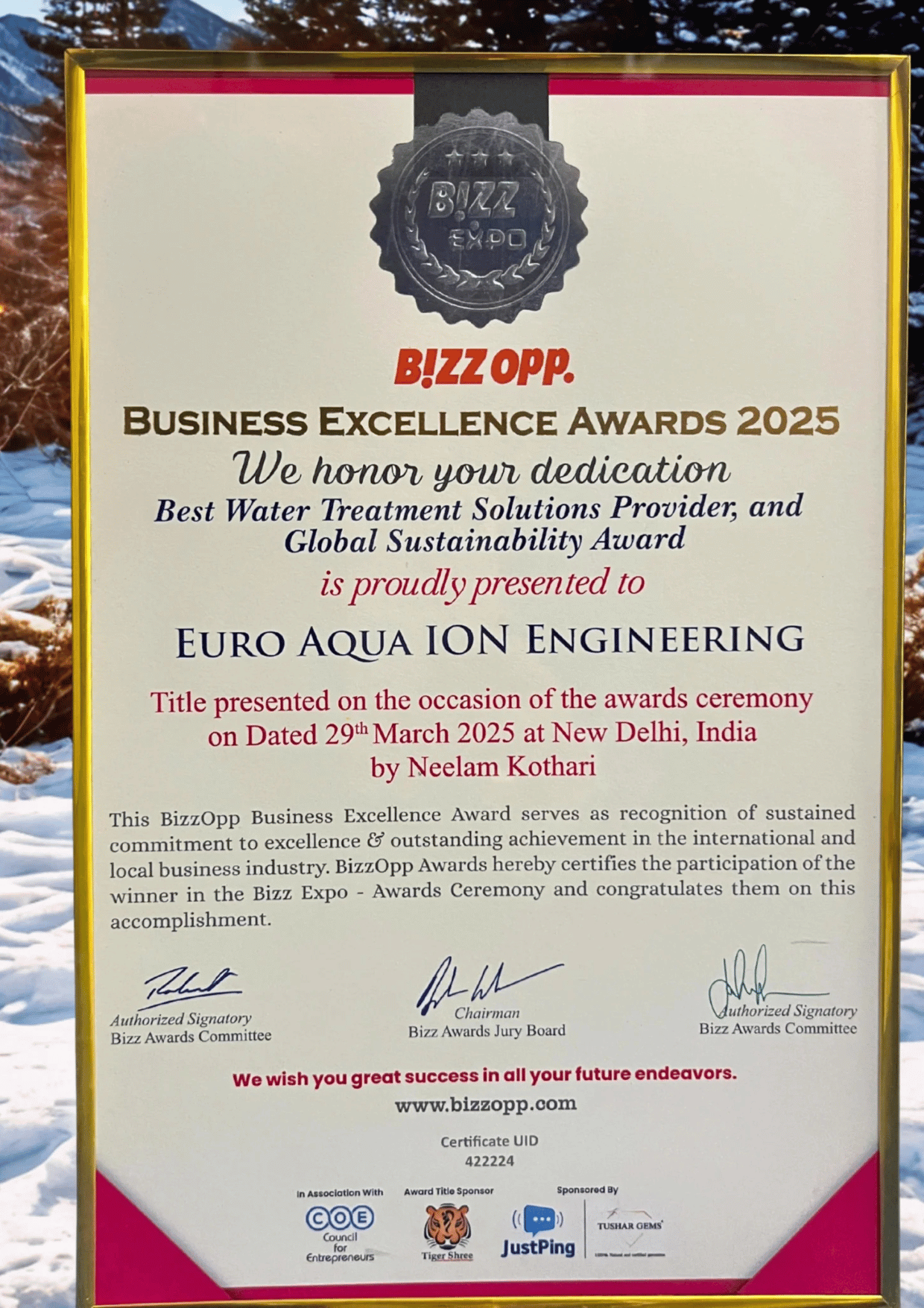 This award recognizes Euro Aqua Ion Engineering for delivering high-quality and reliable water treatment solutions, showcasing excellence in ETP, STP, and RO systems.