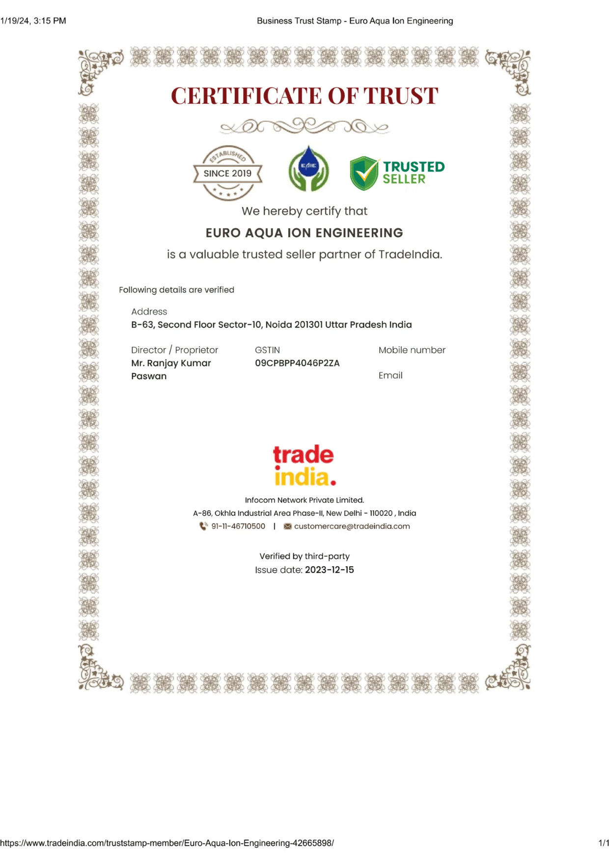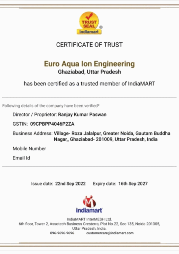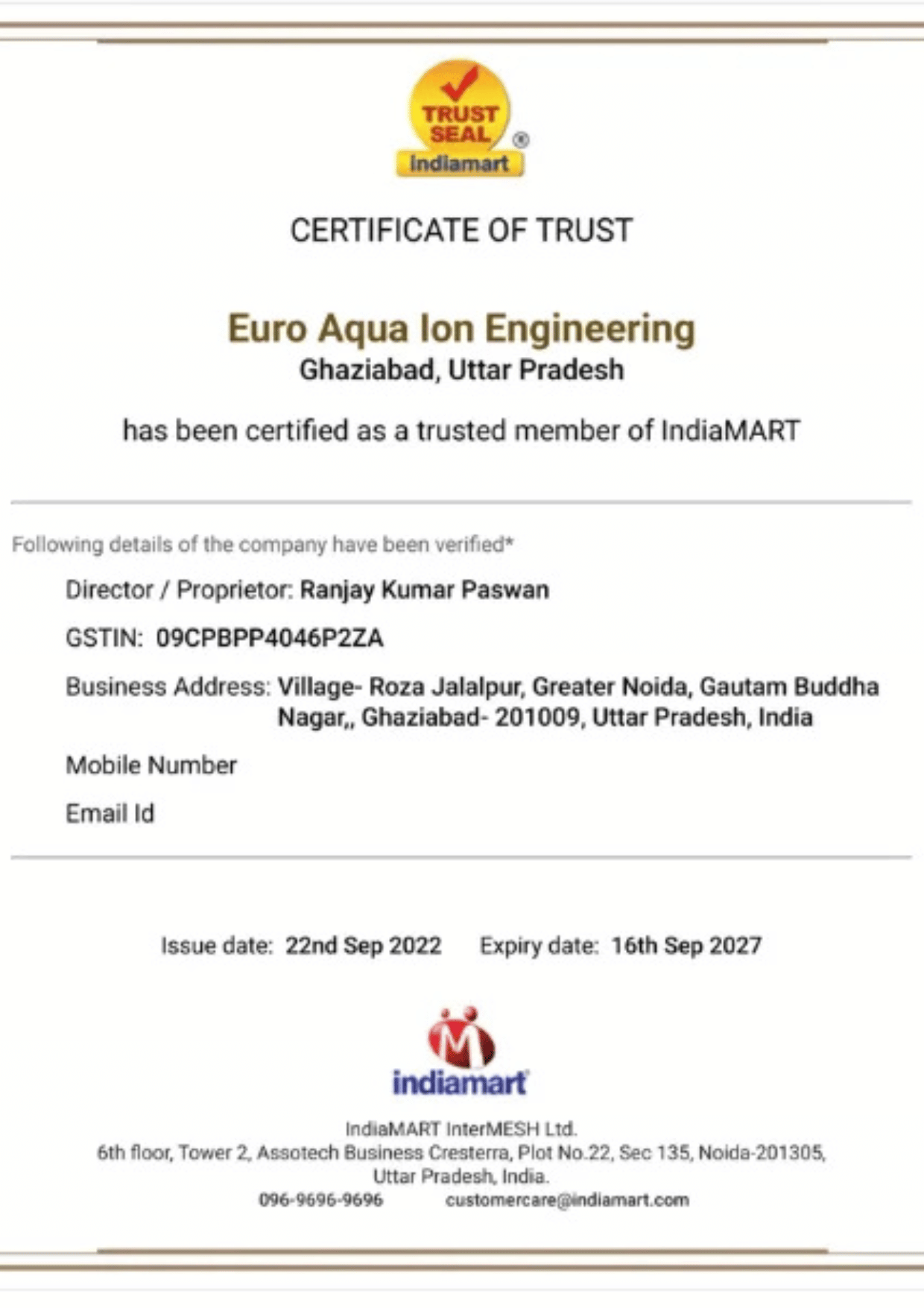 This certification signifies that Euro Aqua Ion Engineering is a verified and trusted supplier on Trade India, ensuring authenticity and reliability.