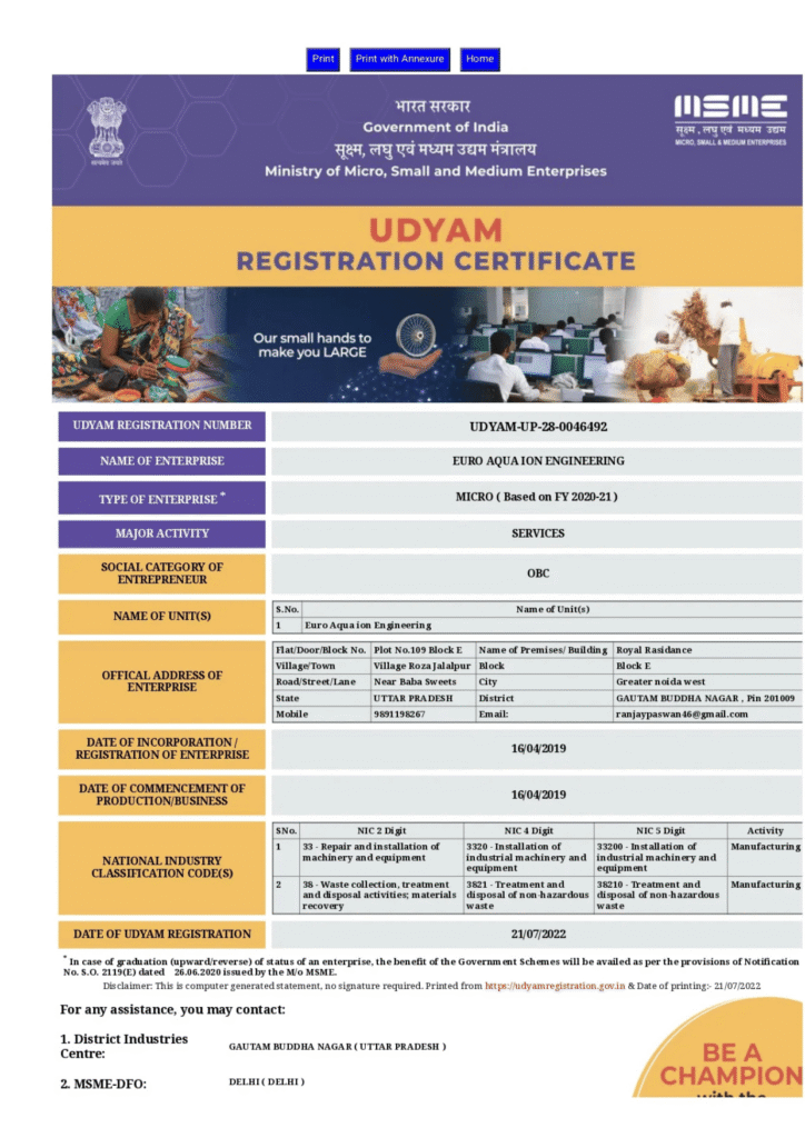 This certificate confirms that Euro Aqua Ion Engineering is officially registered as an MSME, supporting small and medium enterprise development under the Government of India.